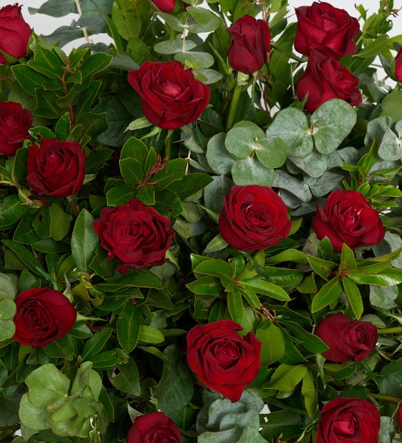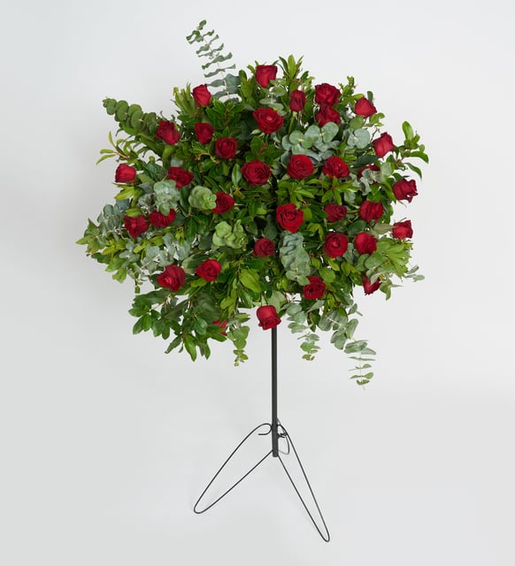 Sessiz bir nefes gibi, kırmızının derinliğiyle yeşilin dinginliği buluşuyor. Ferforjenin zarif çizgileri arasında yükselen kırmızı güller, kalbin sakladığı yoğun duyguları incelikle taşır; okaliptusun serin kokusu ise anın üzerine bir tazelik perdesi serer. Bu çelenk, neşeyi ve hüznü, başlangıçları ve hatırlamaları aynı zarif denge içinde barındırır.