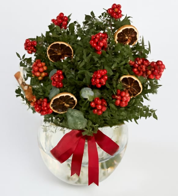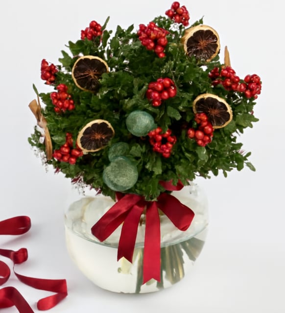 Kışın sükunetinde parlayan küçük kırmızı taneler… İple bir araya getirildiklerinde, eski bir inanışa göre mutluluğu ve bereketi birbirine bağlarlar. Şeffaf camın içinde, yılın son günlerinin sıcak ışığına benzeyen bir duruluk. Kokina, yeşilin dinginliğiyle kırmızının canlılığını buluşturur; tarçının sıcak notası, okaliptüsün serin dokunuşu ve kurutulmuş limonun altın halkaları bu sessiz kutlamayı tamamlar. Burlap ip, düzenlemenin doğal kalbini, zamansız bir sadelikle tutar.