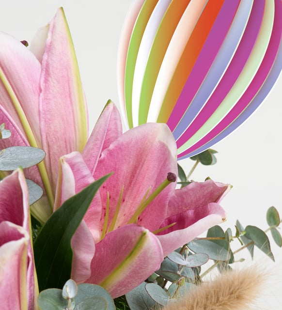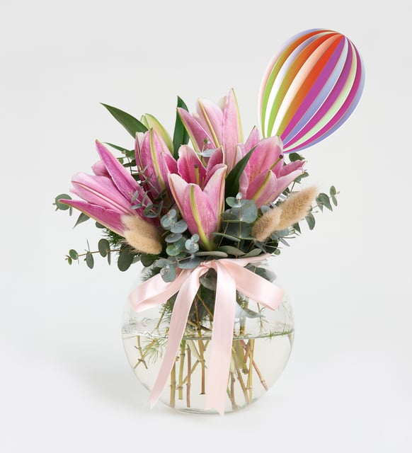 Balon Pankartlı Cam Akvaryumda Pembe Lilyumlar