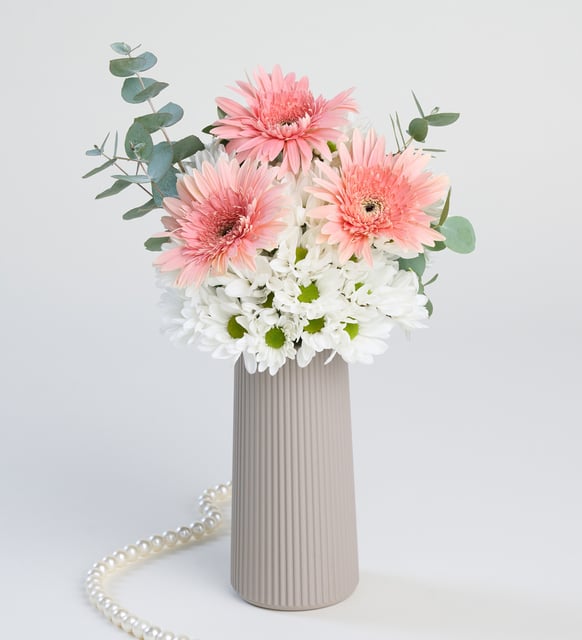 Bej Polimer Vazoda Beyaz Papatyalar & Pembe Gerberalar