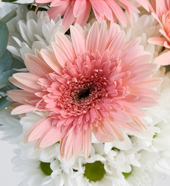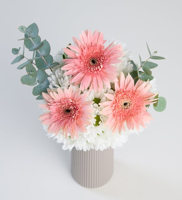 Bu aranjmanda yalınlık ve samimiyet aynı ritimde buluşur. Papatyaların masum berraklığı, gerberaların tatlı pembe tonu ile dengelenir; gündelik anlara zarif bir ferahlık, özel anlara içten bir zarafet katılır.
