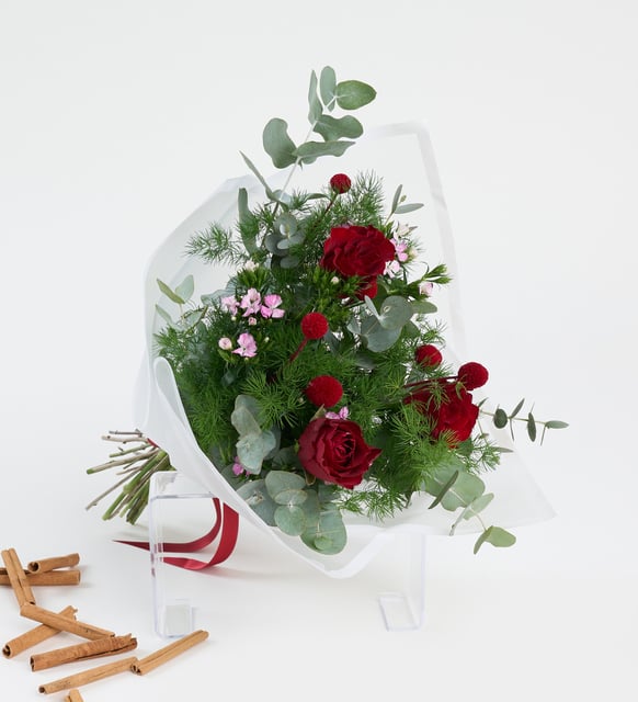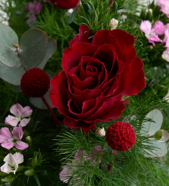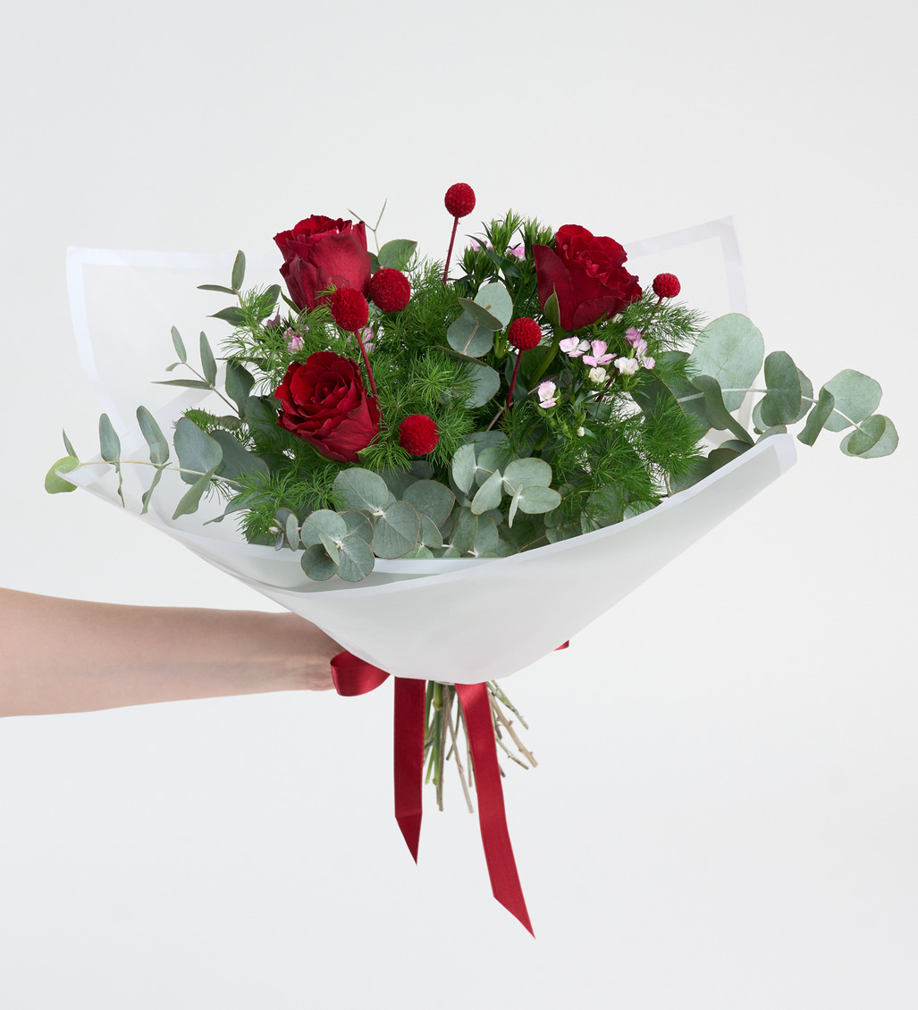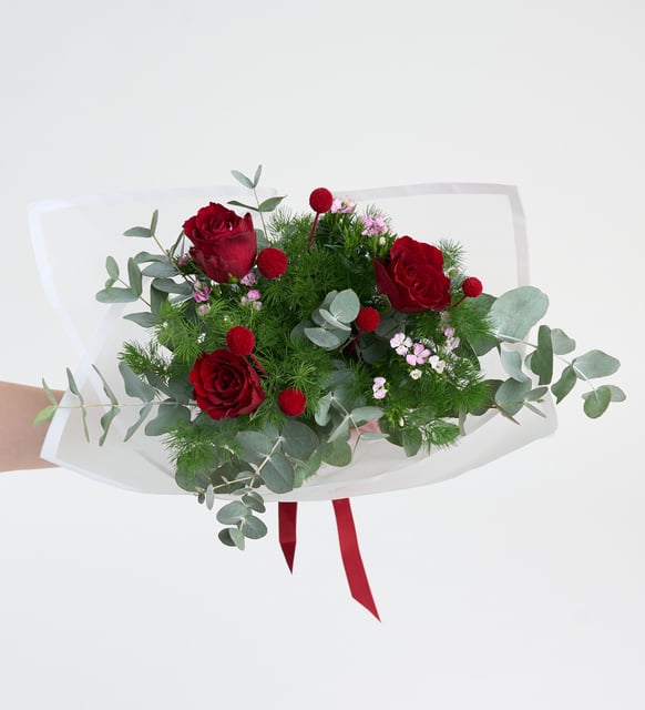 Kırmızının derinliği, beyazın dinginliğiyle buluştuğunda ortaya sakin ama kararlı bir ritim çıkar. Bu buket, kadife dokulu güllerin sıcak tonunu okaliptusun serin nefesiyle yumuşatırken, mirkeladusun dingin çizgisi kompozisyona zarif bir düzen katar. Hüsnüyusuf demetlerinin ince taneli yüzeyi, kırmızı Craspedia’nın modern vurgusuyla birlikte okunur; kenarları beyaz çizgili beyaz buket kağıdı ve kırmızı kurdele, bütün hikayeyi sade bir çerçeveye yerleştirir. Kısa bir bakışta bile içerde bir duruş hissedilir: tutku, ölçü ve sükûnet.