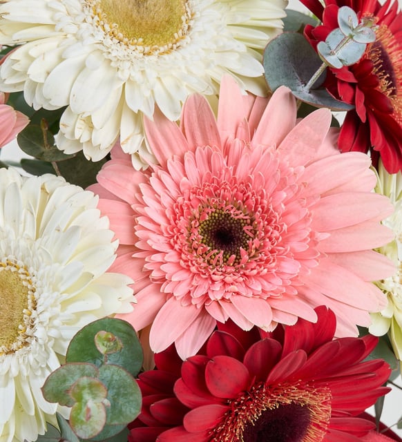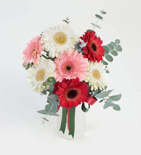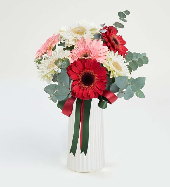 Beyaz Çizgili Polimer Vazoda Beyaz Kırmızı Pembe Gerberalar