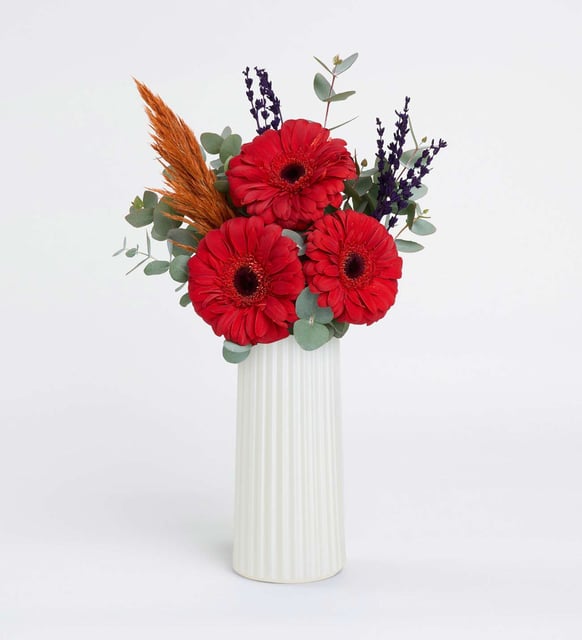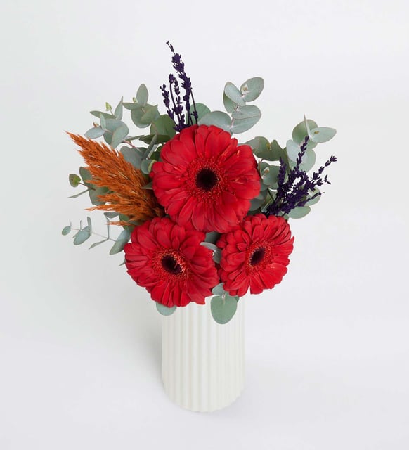 Kırmızının sakin bir sıcaklığa dönüştüğü anı hatırlatan bir düzenleme: beyaz çizgili, sedefsi parıltıya sahip polimer vazonun içinde, gerberaların içten ve yakın duran tonu. Okaliptusun ferah dokusu, pampasın yumuşak silueti ve lavantanın dinginliğiyle, modern ve sade bir ritim kurar. Dostluk, sıcaklık ve samimiyet bu kompozisyonda söz olmadan hissedilir; yaşam alanına zarif bir duruş, kısa bir suskunluk ve iyi gelen bir nefes ekler.