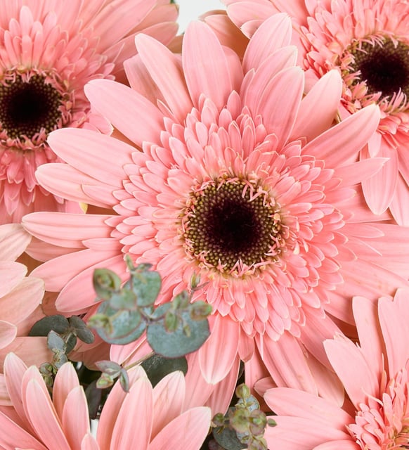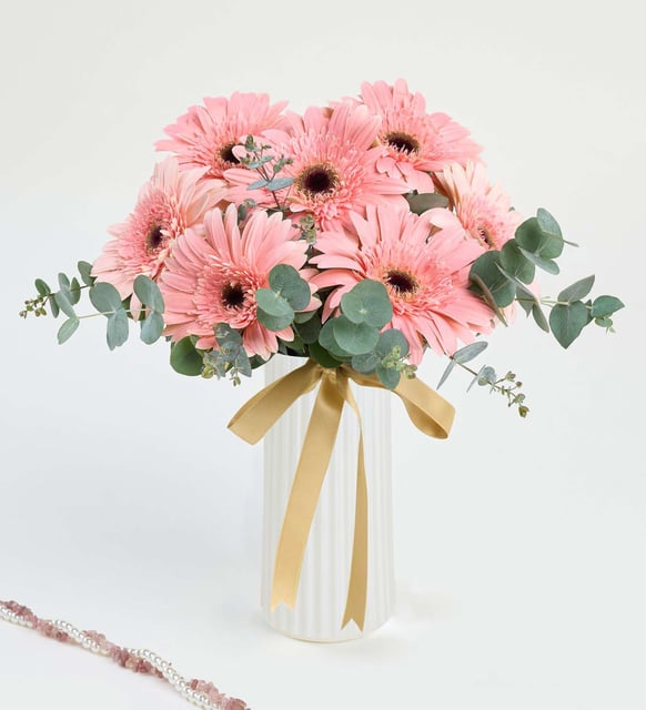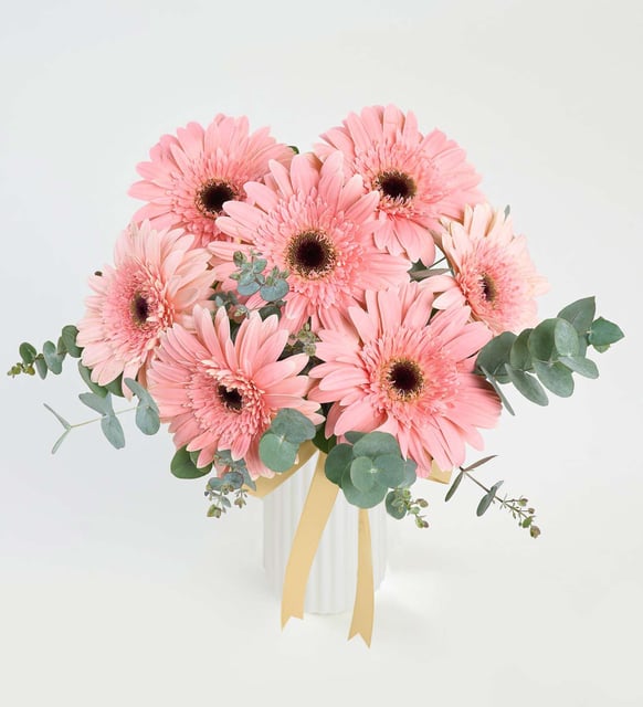Yumuşak bir sabah ışığı gibi, pembe gerberalar beyaz çizgili polimer vazonun sedefli yüzeyinde huzurla toplanır. Okaliptusun serin nefesi aranjmana dingin bir ritim verir; zarif bir kurdele ışığı yakalayıp usulca parlar. Bu birliktelikte pembe tonlar yalnızca neşeyi değil, içten bir dayanıklılığı da fısıldar. Sade, modern ve narin… Yaşam alanına sessiz bir tazelik, içe dönük bir sevinç katarken sıradan anları durup bakmaya değer kılar.