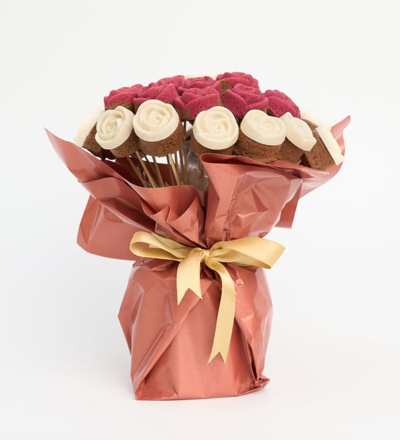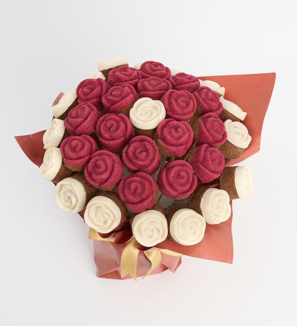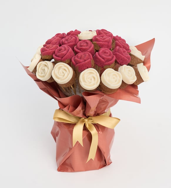 Beyaz Güllü ve Kırmızı Gül Desenli Kek Buketi