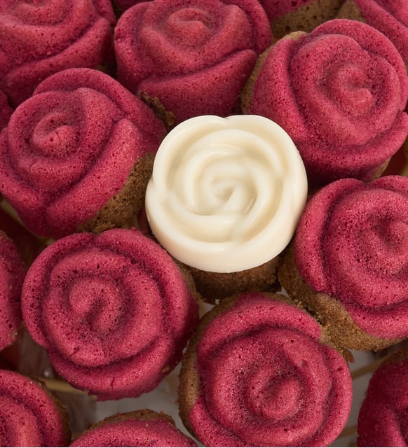 Beyazın dinginliği ile kırmızının sıcak hatırası bir araya geliyor. Koyu somon tonlarında zarifçe sarılan buketin içinde, siyah kakaolu silindirlerin üzerine yerleşen beyaz gül ve fildişi konfiseri dokunuşları, sükunetle açan bir çiçeğin ışığını taşır. Aralarda kırmızı gül formunda işlenmiş parçalar, kalbin ritmini usulca duyurur. Kurdele yalnızca bağlamaz; anının etrafına ince bir çerçeve çizer. Göz sakinleşir, damak yumuşak bir mutluluğa yaklaşır.