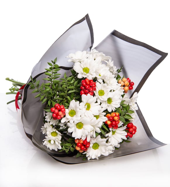 Beyazın duruluğu ile kokinanın yakut kırmızısı, mat siyah buket kâğıdının ince siyah çizgili kenarlarında sade bir ritim kurar. Kış sabahının taze berraklığını, yeni yılın temiz sayfasını ve içten bir tebessümü aynı anda taşır. Göz alıcı değil, derin ve dingin; gündelik anlara zarif bir kutlama hissi ekler.