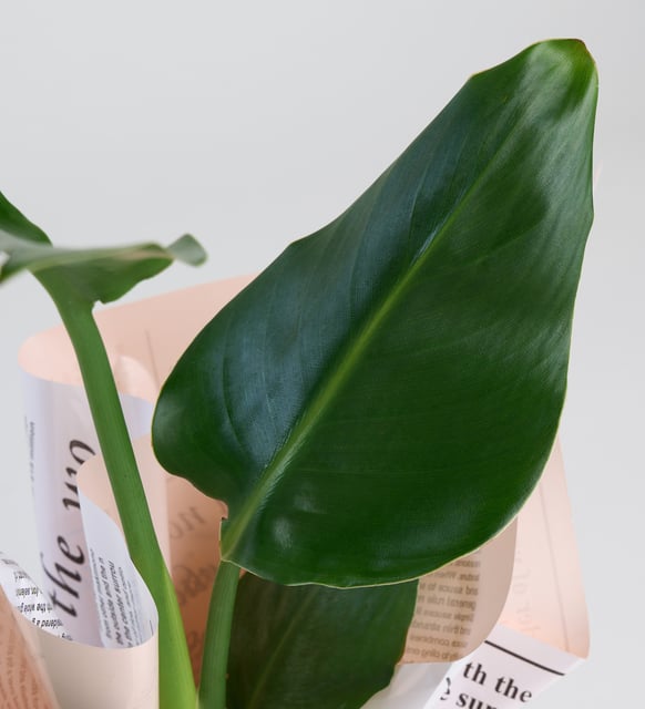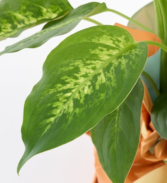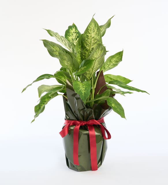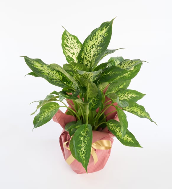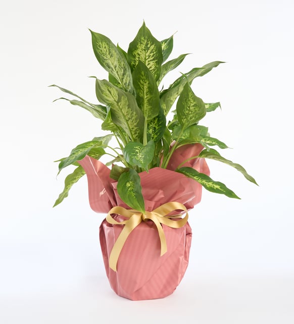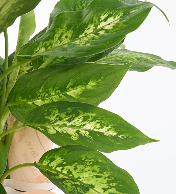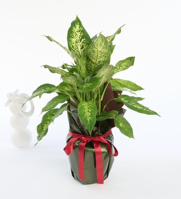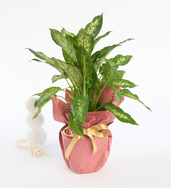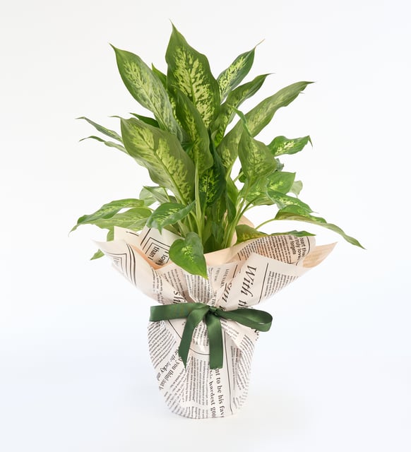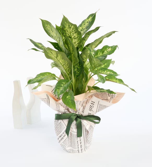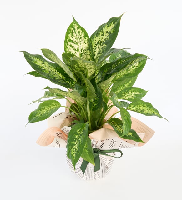 Yumuşak bir sabah ışığını içeri taşıyan, dingin ve modern bir yorum. Camilla difenbahyanın krem ve yeşilin birbirine karışan yaprakları, beyaz polimer saksının sade çizgileriyle buluşurken pembe gazete buket kağıdı ve koyu yeşil kurdele, kompozisyona zarif bir not bırakır. Sessiz, derin ve ferah… bulunduğu yerde hava değiştirir, ritmi yavaşlatır, duyguyu inceltir.