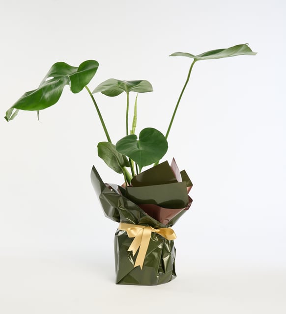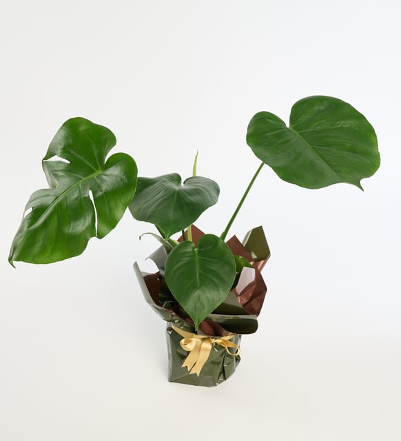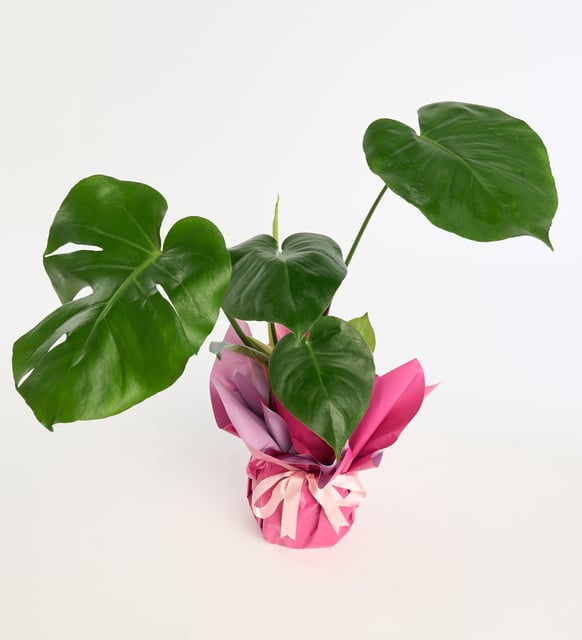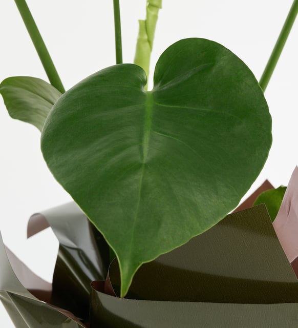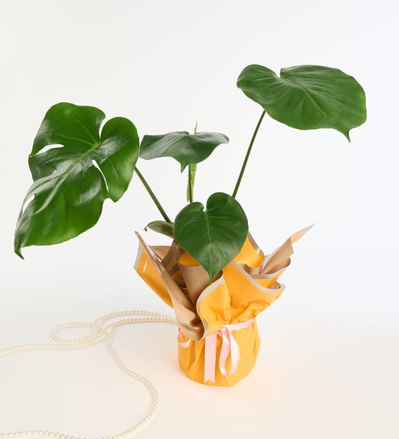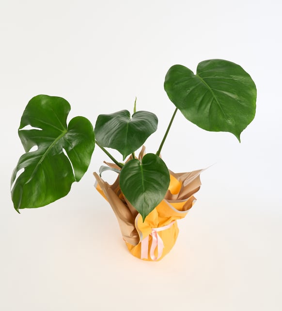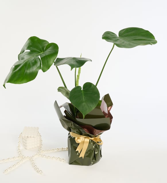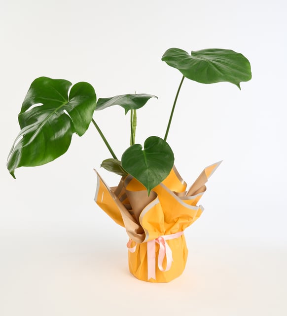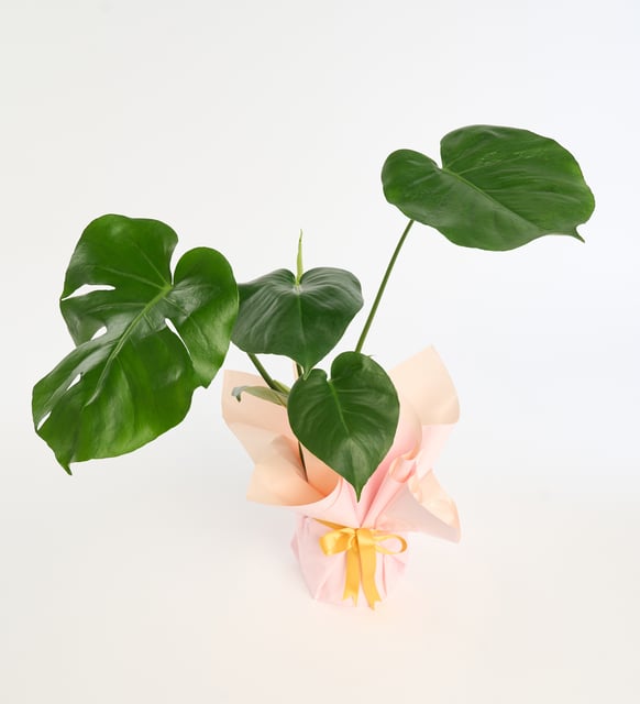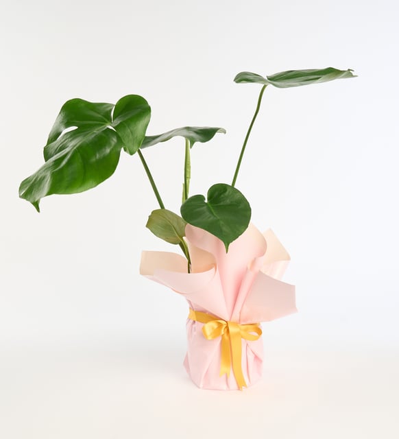 Geniş yapraklarının gölgesinde, mekâna serin ve huzurlu bir ritim taşır. Beyaz polimer saksı, sade çizgileriyle bitkinin doğal zarafetini öne çıkarırken, sarı buket kâğıdının sıcak tonu ve açık pembe kurdelenin hafif dokunuşu aranjmana yumuşak bir neşe katıyor. Bir köşede, sabah ışığıyla parlayan yeşiller; küçük bir kaçış, usulca hatırlatan bir başlangıç hissi.