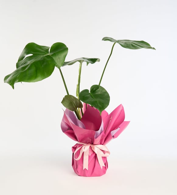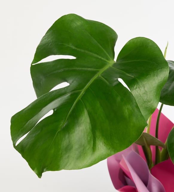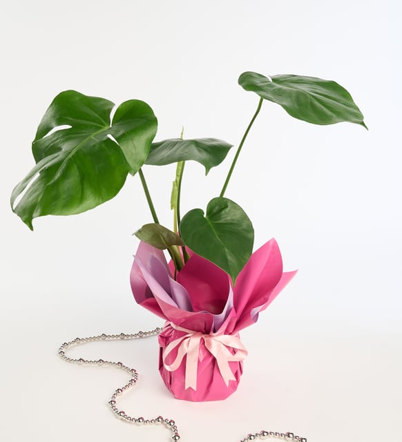 Geniş, parlak monstera yapraklarının sakin ritmi, mekana yumuşak bir tropik ferahlık taşır. Beyaz polimer saksının yalın çizgisi, lila ve canlı pembe tonlarında buket kâğıdıyla çevrelenir; açık pembe kurdele ince bir tamamlayıcılık hissi verir. 50-60 cm’lik zarif bir yükseklikte, gündüz ışığıyla hafifçe değişen gölgeler yaratır ve bulunduğu yere huzurlu bir odak noktası kazandırır.