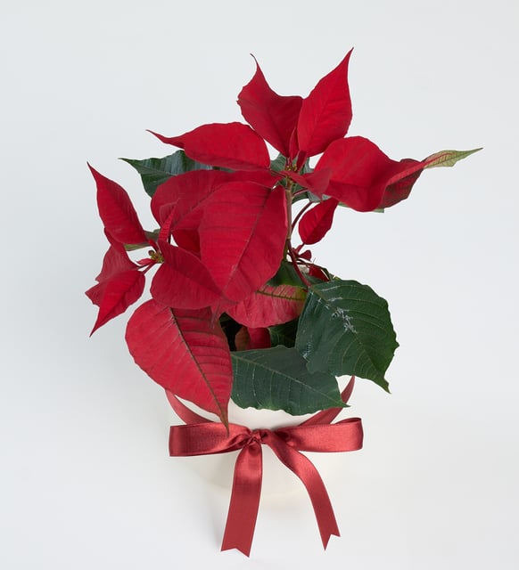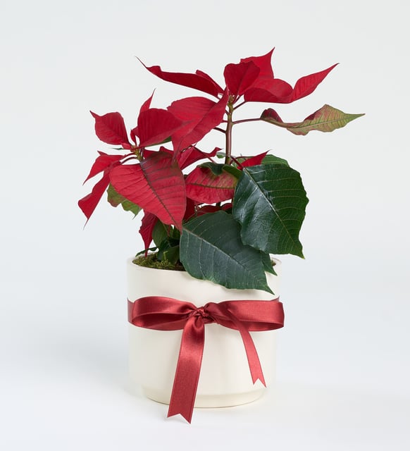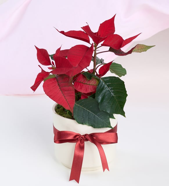 Sessiz bir kış sabahının sıcaklığı gibi… Beyaz bir zeminde parlayan kırmızı yapraklar, mekana yumuşak bir neşe ve huzurlu bir başlangıç duygusu taşır. Ponsetya, evin içinde hatıraları nazikçe görünür kılar; sevgiyle saklanan anların, içten teşekkürlerin ve iyi dileklerin sakin dilini konuşur.