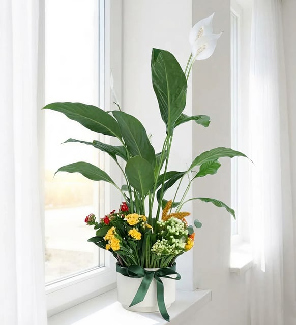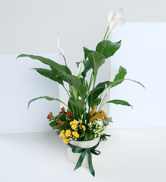Sakin bir sabah ışığı gibi, spatifilyumun beyaz çiçekleri mekana yumuşak bir dinginlik taşır. Kalanchoe’nin turuncu, beyaz ve kırmızı tonları küçük mutluluk anlarını hatırlatır; okaliptusun serin dokusu ve sarı setaryanın ince ritmi aranjmana zarif bir denge ekler. Beyaz saksının sade çizgileriyle tamamlanan kurdele detayı, bütünün kendiliğinden şıklığını fısıldar.