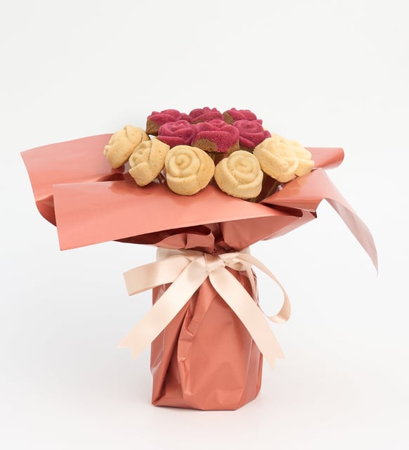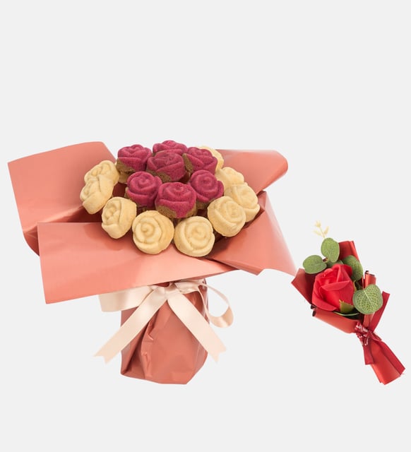 Dingin bir kutlamanın tadı, zarif bir buluşmanın rengi. Beyazın sakinliği ve kırmızının sıcaklığı, koyu somon tonlu buket kağıdının yumuşak fonunda buluşur. İnce bir romantizmi taşıyan yapay kırmızı gül, anın hafızasını uzun süre korurken, her bir gül formundaki kek süzülmüş bir mutluluk gibi dilin üzerinde erir.