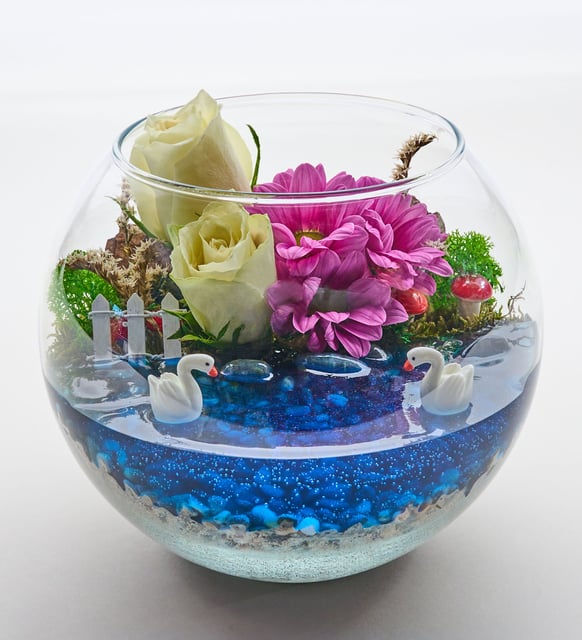 Beyaz güllerin dingin zarafeti ile pembe papatyaların yumuşak neşesi, cam fanusun içinde küçük bir bahçe sessizliği kuruyor. Ağaç kabuğu ve minik bahçe çiti, çakıl taşlarıyla birlikte pastoral bir patikayı hatırlatırken, zarif kuğu figürü bu sahneye narin bir duruş katıyor. Yosun ve tatarika dokuları, doğanın yavaş ritmini taşıyor. Mum jel, kompozisyonu ılık bir parıltıyla tamamlayarak mekana nazik bir sıcaklık yayıyor.