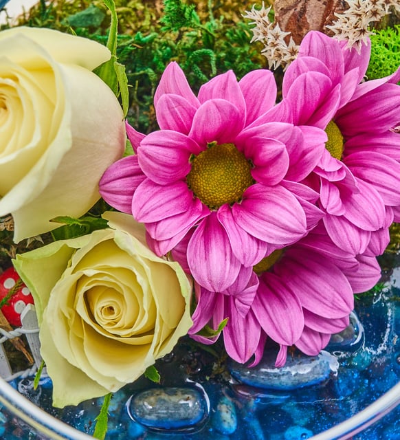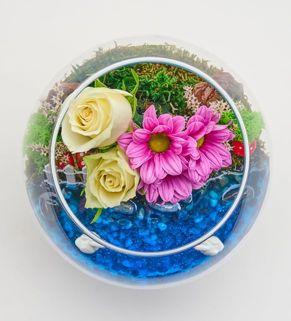 Cam Fanusta Beyaz Gül ve Pembe Papatya Teraryum
