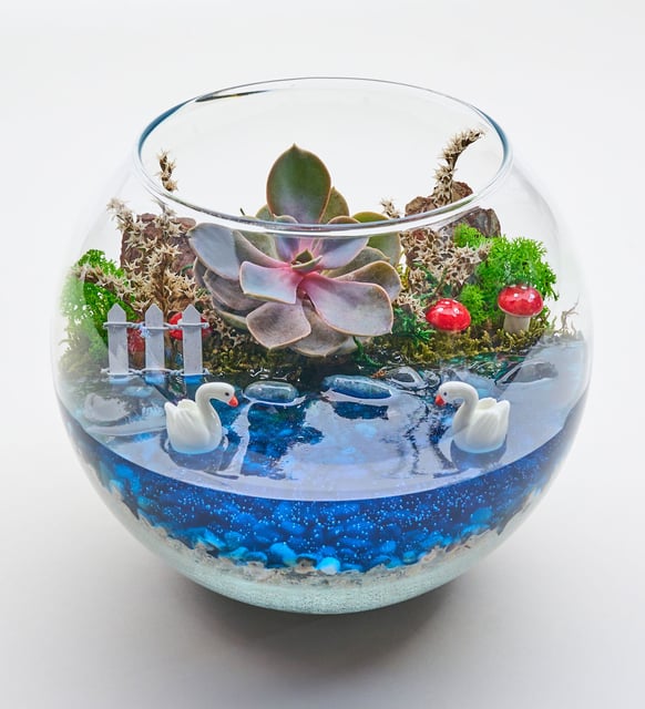 | Süsleme | Bahçe çiti, çakıl taşı, ağaç kabuğu, yosun, kum, tatarika (ithal demet), kuğu, mum jel ve mantar figürleri |