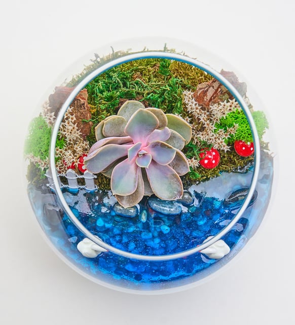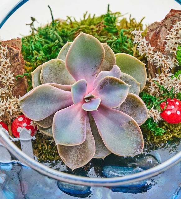 Soluk gül-lavanta tonlarıyla açılan rozet formu, camın berraklığında daha da dinginleşir. Küçük bir peyzaj gibi, çakıl ve kumun sessizliği, yosunun yumuşak dokusu ve ağaç kabuğunun doğal çizgileri arasında Echeveria Perle Von Nurnberg sakin bir ritim kurar. Bahçe çitiyle belirginleşen sınırlar, mum jel içinde parlayan bir an ve zarif bir kuğu figürüyle masalsı bir duruş kazanır; mantar figürleri bu küçük dünyaya sıcak bir hikaye fısıldar. Evde ya da ofiste, aydınlık bir köşeye yerleştiğinde, varlığı ortamın nefesini derinleştirir.