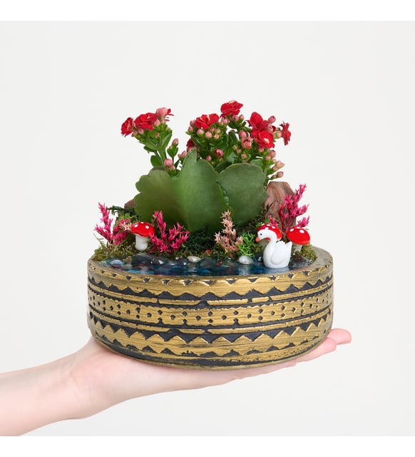Camın berraklığında yumuşayan kırmızı… Mini kalanchoe, küçük bir manzaranın kalp atışı gibi; çevresinde yosunların sessiz serinliği, toprağın dingin kokusu. Kuğu figürü sükûneti taşıyor, çakıl ve kum ise akışın ritmini fısıldıyor. Tatarika ile ince bir dokunuş; mum jel ve minik mantarlar sıcak, tanıdık bir his bırakıyor. Hepsi bir araya geldiğinde, fanusun içinde zaman yavaşlıyor.