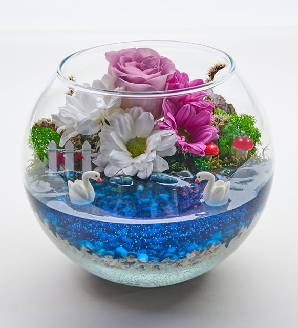 Lila güllerin dingin zarafeti, beyaz ve pembe papatyaların saf neşesiyle buluşur. Cam fanusun içinde, yosunun serin dokusu ve doğal çakıl taşlarının dinginliği küçük bir bahçe hissi uyandırır. Bahçe çiti ve kuğu figürü, zamanın yavaş aktığı bir sahneyi fısıldar; ağaç kabuğu, kum ve mum jel, doğanın sessiz ritmini incelikle taşır. Mantar detayları, bir masalı gerçek kılan küçük duraklar gibi aranjmana sıcaklık ekler.