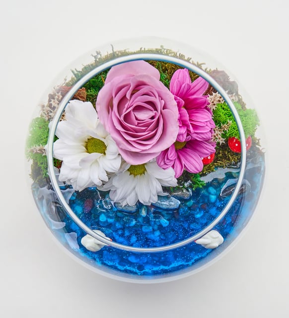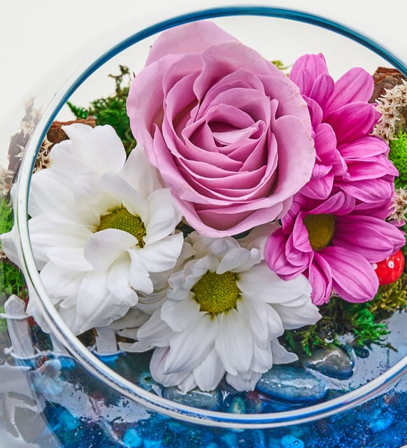 Cam Fanusta Lila Gül ve Papatyalar Teraryum