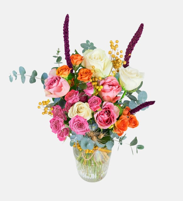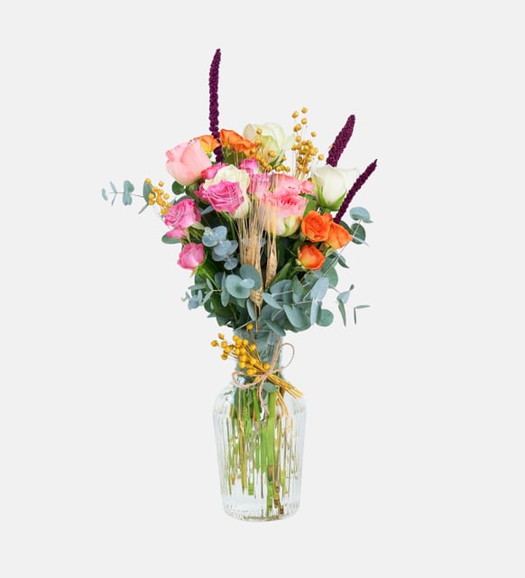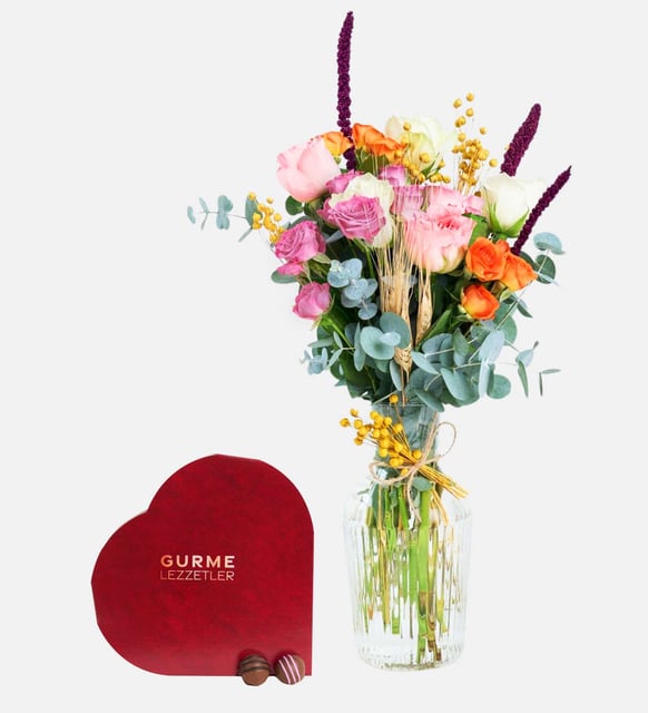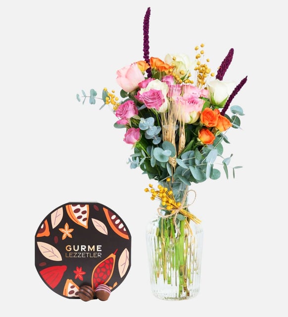 Cam sürahi formunda vazonun berraklığında, pembe ve renkli güller birbirine yaslanarak gün ışığını yumuşatır. Neşeli tonlar, sakin bir huzurun etrafında kitap sayfaları gibi açılır; renklerle gelen enerji, ince bir zarafetle dengelenir. Sofrada mumlar yanarken ya da evde sessiz bir akşamı süslerken, bu düzenleme bulunduğu ortamı nazikçe ısıtır.