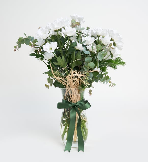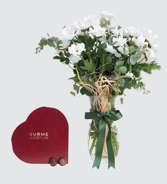 Bir sabahın hafifliği gibi… Beyaz papatyaların duru neşesi, okaliptusun ferah nefesiyle buluşur; koyu yeşil kurdele vazonun şeffaf silindir formunda sakin bir çizgi bırakır. Rafyanın doğal dokusu aranjmana sıcaklık eklerken, kalp formundaki trüf kutusunun zarif sürprizi bu dingin tabloya tatlı bir fısıltı katıyor. İncelikle düşünülmüş küçük bir mutluluk: sade, içten ve hatırlanmaya değer.