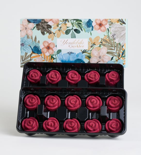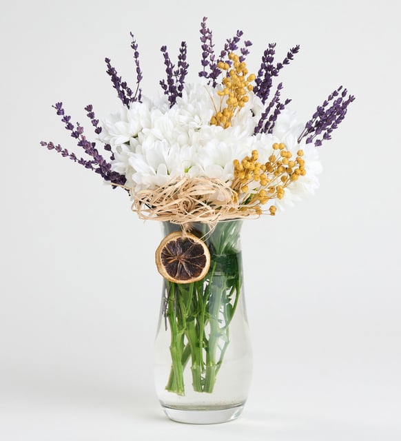 Berrak camın içinde, beyaz papatyalar bir sabah serinliğini taşır; mor lavanta usulca yaklaşır ve mekana yumuşak bir dinginlik bırakır. Yanında, kutusunda saklanan 20 adet kırmızı gül biçimli kek, anıların üzerine ince bir tatlılık serperek sahneyi tamamlar. Zarif, sade ve huzurlu bir kompozisyon; bir odanın ritmini yavaşlatıp kalbin sesini duyurur.
