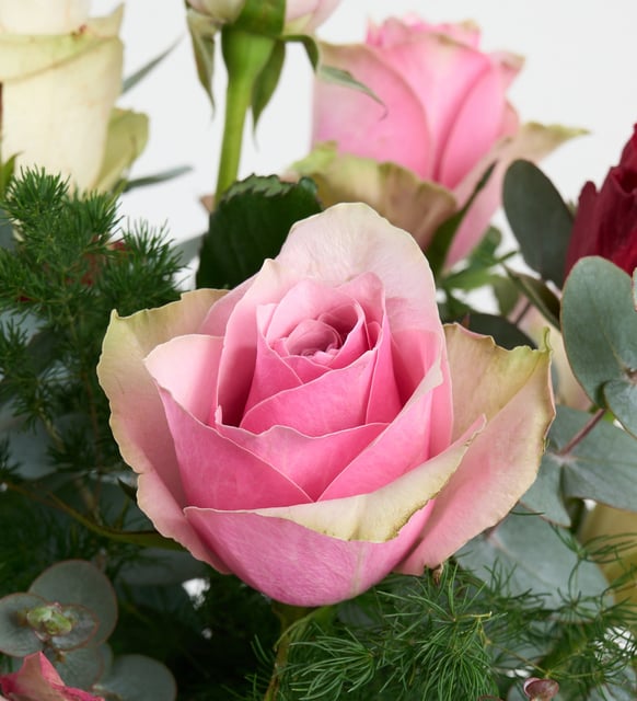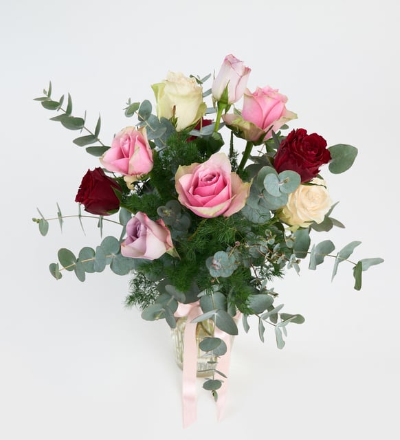 Kırmızının sıcak nabzı, beyazın dingin nefesi; pembe ve lilanın zarif fısıltıları. Camın berraklığı içinden yükselen bu kompozisyon, okaliptusun serin tınısı ve mirkeladusun ince dokunuşuyla bir araya gelerek mekana yumuşak bir ferahlık taşır. Açık pembe kurdele, bütünün etrafında hafifçe dolaşan bir hatıra gibi…