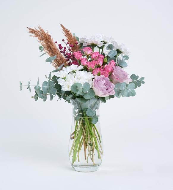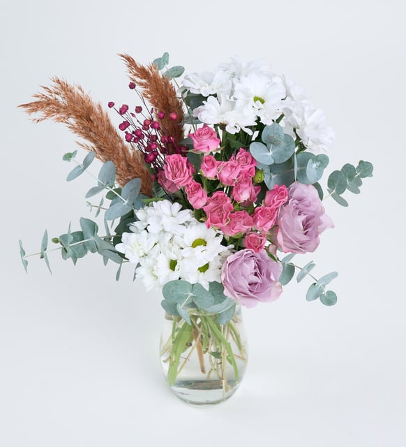 Pastel bir sabahın berrak ışığı gibi. Pembe çardak güller ile lila tonların dinginliği, beyaz biçme papatyaların saf neşesine karışırken, pampasın dokusu ve okaliptusun ferahlığı aranjmana yumuşak bir ritim kazandırır. Mor luna çiçekleri, kompozisyonun içe dönük zarafetini derinleştirir. Paşabahçe kristal cam silindir vazo, bu sakin armoniyi duru bir çizgiyle taşır.