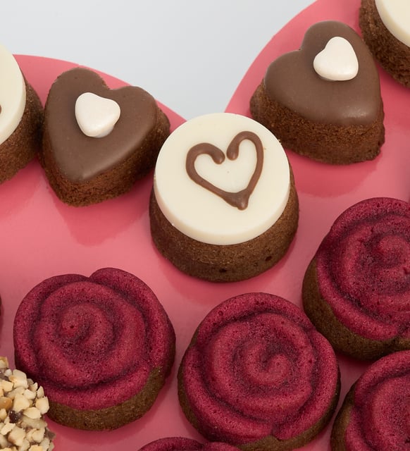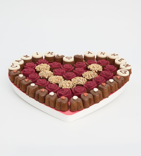 Bir araya geliş biçimi kadar hissi de önemser. Kırmızı gül formundaki keklerin sıcak tonu, siyah kalplerin zarafetiyle buluşur; trüf dokunuşları kavrulmuş pirinç fındığın hafif çıtırtısıyla tamamlanır. Bütünü, gösterişten uzak bir şıklıkta, kutlama yerine sakin bir teşekkür gibi durur.