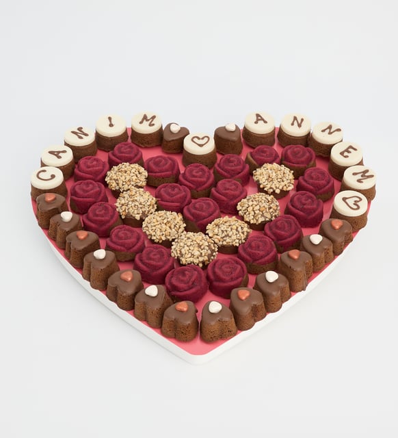 Somon tonlarında büyük bir kalp üzerine yerleşen siyah ve kırmızının dengesi, evin en sıcak köşesinde saklanan anıları hatırlatır. Parlak sedefli kalp şekerler ve zarif konfiseriler, ışığa değdikçe yumuşak bir parıltı bırakır. “Canım Annem” yazısı, yüksek sesle değil, kalbin içinden fısıldanan bir cümle gibi… Her bir kekte dokunun hafifliği, kakao ve sütlü notaların sakin uyumu, sevginin nesneye dönüşmüş hâli.
