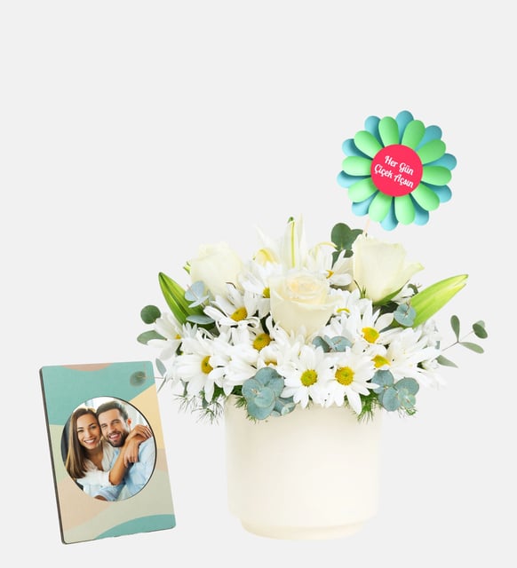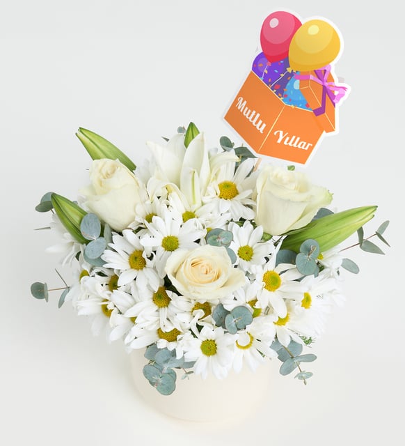 Balon Pankartlı Polimer Saksıda Beyaz Gül ve Papatya