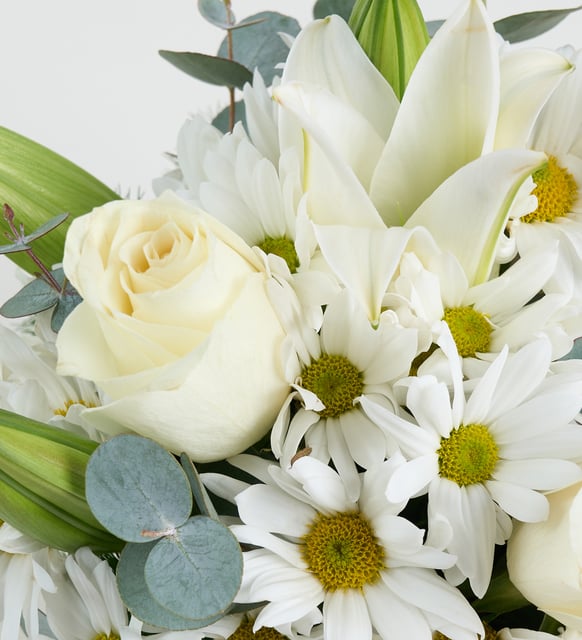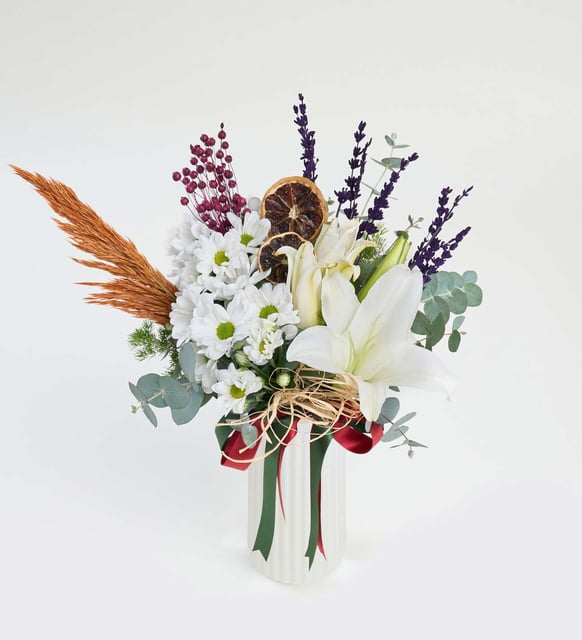 Beyaz Çizgili Polimer Vazoda Beyaz Lilyum ve Papatyalar