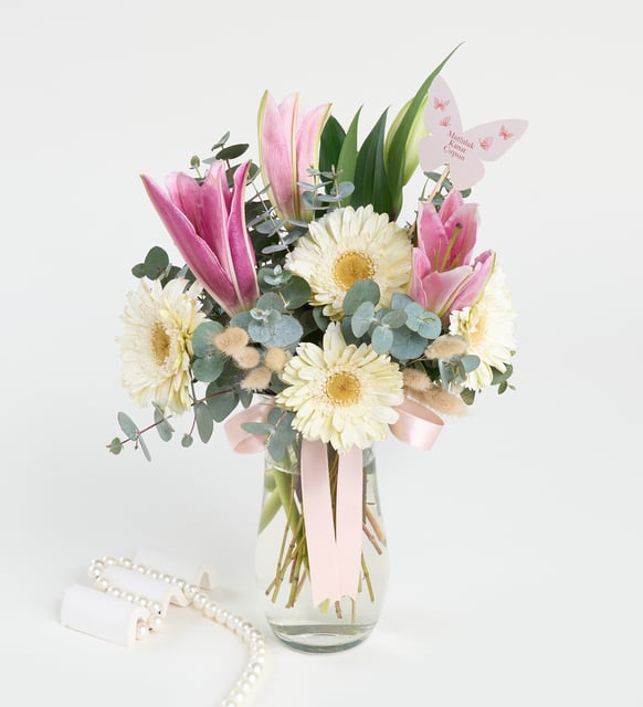 Vazoda Kelebekli Pembe Lilyum ve Beyaz Gerberalar