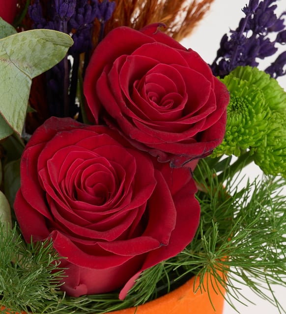 Turuncu Kadife Kutuda Kırmızı Güller ve Okaliptus