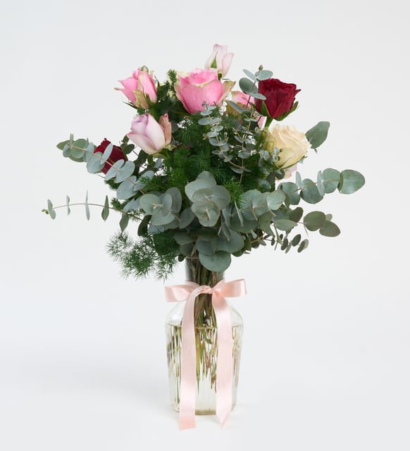 Cam Vazoda Kırmızı Beyaz Lila ve Pembe Güller