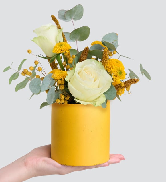 Sarı Saksıda Beyaz Güller ve Sarı Kasımpatı