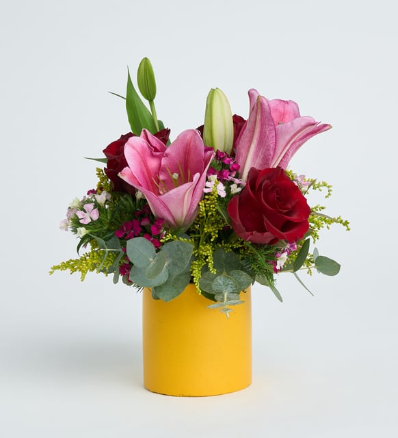Sarı Beton Saksıda Pembe Lilyum ve Kırmızı Güller