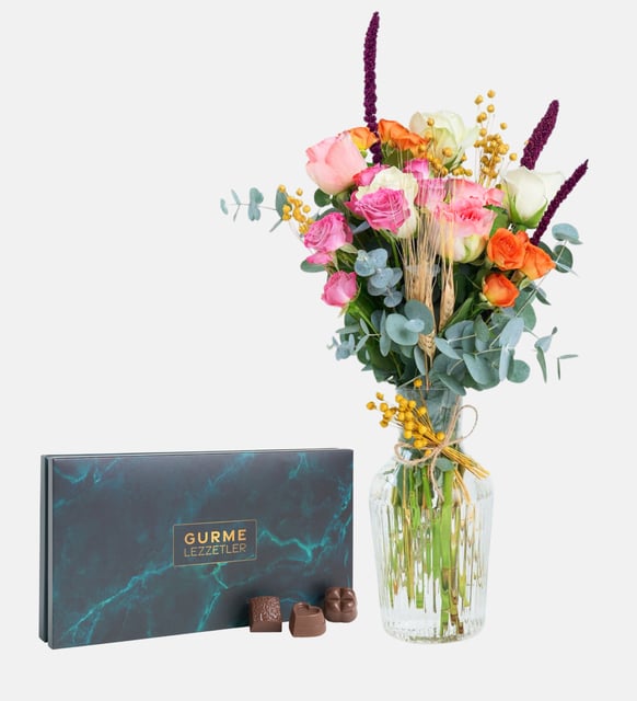 Turuncunun sıcak dokunuşu ile pembenin nazik sesi, sarı luna ve beyaz gülün dinginliği içinde yumuşar. Başak buğdayının toprakla kurduğu bağ, okaliptüsün serin nefesiyle ferahlar; mor setteria beklenmedik bir vurgu gibi araya girer. Çizgili cam sürahi, ışığı berrak bir ritimle kırarak renkleri düzenler; yanında Yeşil Gurme Lezzetler Kokolin Kutusu, anı tatlı bir fısıltıyla tamamlar.
