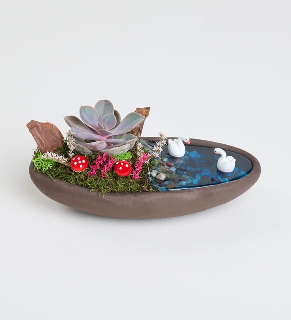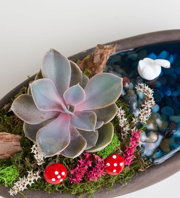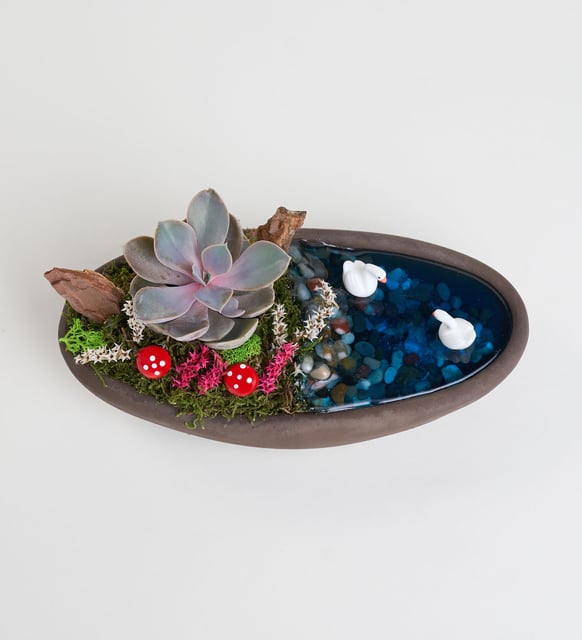 Solgun pembe ile gri arasındaki zarif geçişler, taşın mat dokusunda sakin bir ışık gibi yerini bulur. Echeveria Perle Von Nurnberg, küçücük bir peyzajın içinde duruluğu hatırlatan bir kuğu figürü, saydamlığını koruyan mum jel, nazikçe serpiştirilmiş çakıl taşları ve ağaç kabuğunun sıcak dokusuyla dengelenir. Evde ya da ofiste, aydınlık bir köşede sessizce var olur; ritmini dayatmadan, ortamın akışına ince bir dinginlik bırakır.
