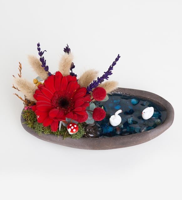 Kırmızının sıcak nabzı, altın tonlu küçük kürelerle buluşuyor. Gerbera, kompozisyonun kalbinde yoğun bir duyguyu taşırken; craspedia neşeli bir ışık gibi etrafa yayılıyor. Bej lagurusun yumuşak dokusu, sarı luna ve lavantanın dinginliğiyle birlikte, mekâna sakin bir ritim ve zarif bir denge getiriyor. Modern çizgili dekor saksı, doğal dokularla karşılaşınca, yaşam alanında kendine güvenen ama sakin bir varlık oluşuyor.