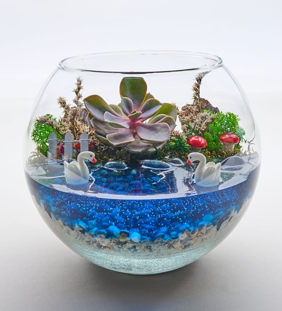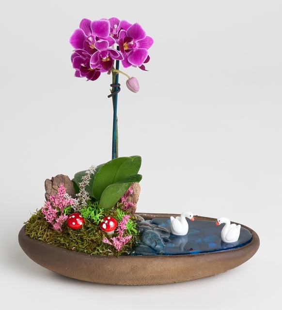 Narin bir duruş, sakin bir sahne. Tek dal mini orkidenin dinginliği, taş tozu, beton ve kompozit karışımlı dekor saksının içinde küçük bir manzara olarak açılıyor. Ağaç kabuklarıyla dokulu, çakıl taşlarıyla yalın; kuğu figürü su kıyısındaki bir anı fısıldarken kum, mantar ve mum jelin saydam ışıltısı bu minyatür dünyaya zarif bir derinlik katıyor. İthal tatarika demetleri, yosun ve toprakla tamamlanan düzenleme, doğanın iç sesiyle ev içi ritmine nazikçe eşlik ediyor.