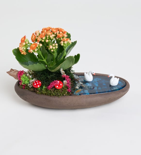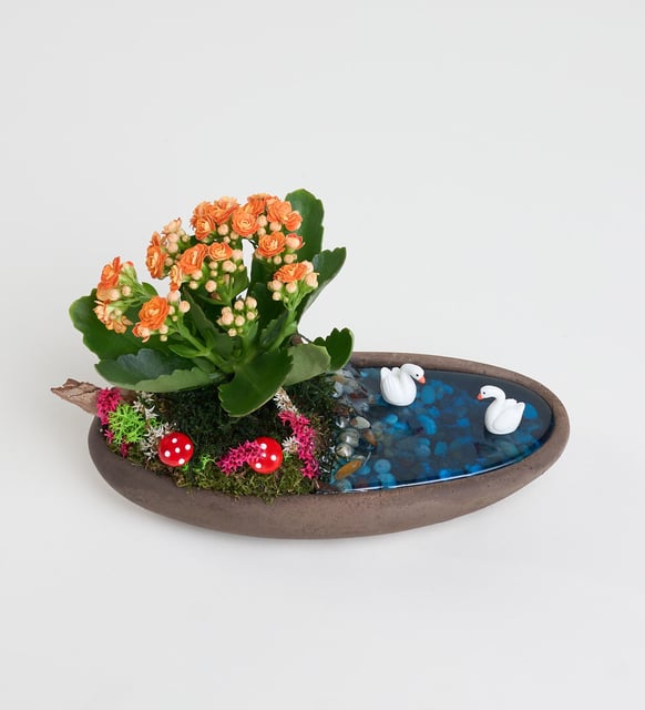 Güneşin ilk ışığını andıran turuncu kalanchoe, taş tonlarında, alçak ve geniş bir dekor saksı içinde küçük bir manzara kurar. Kuğu figürü sessiz bir göl sabahını, mantar ve tatarika demeti ormanın derinliğini, yosun ve çakıl taşları yumuşak bir patikayı çağrıştırır. Ağaç kabuğunun doğal dokusu ile bütünleşen bu sahne, evin içinde ritmi yavaşlatan ince bir huzur bırakır. Renk canlı, duygu sakin; bakış bir süre orada kalmak ister.