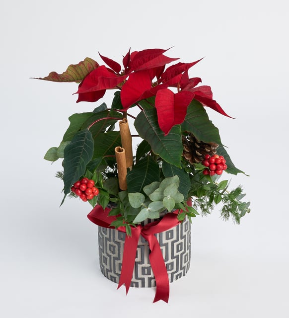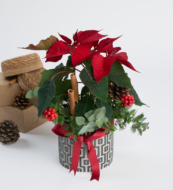Desenli Beton Saksıda Ponsetya ve Kokina Çiçekleri