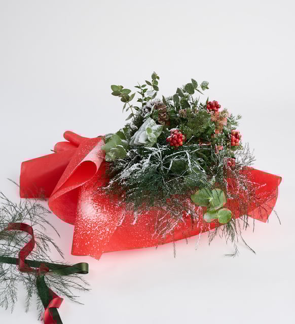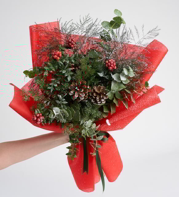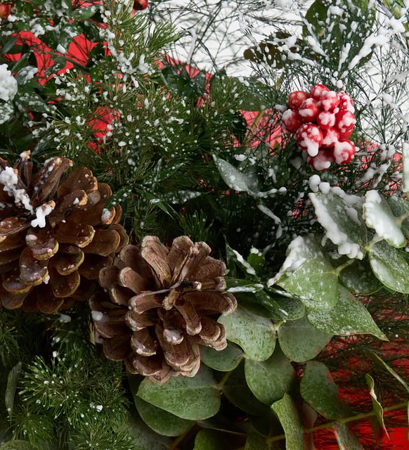 | Süsleme | Kokina dalları, kozalak, okaliptüs ve mirkeladus ile zenginleştirilmiş; koyu yeşil kurdele bağlama ve kar spreyi detaylı tasarım. |