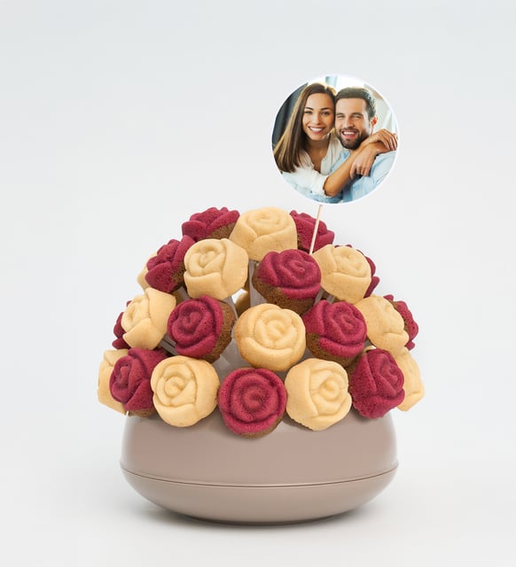 Kırmızının sıcaklığı ve beyazın dinginliği, kahverengi yuvarlak bir saksının içinde buluşur. Gül formundaki küçük kekler, anıların kıyısında duran ince bir duyguyu taşır; yanında yükselen fotoğraf pankartı, bir kareyle hatırayı zarifçe tutar. Görüntü ve tat, sakin bir uyumla birleşir; düşünceleri yormayan, ama kalbe yakın duran bir ritim.