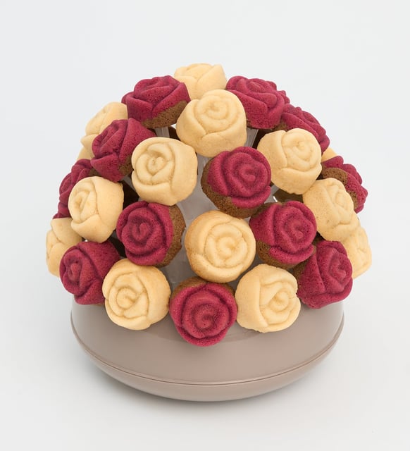 | Süsleme | Kahverengi yuvarlak saksı üzerinde 15 adet kırmızı gül kek ve 16 adet beyaz gül kek |
