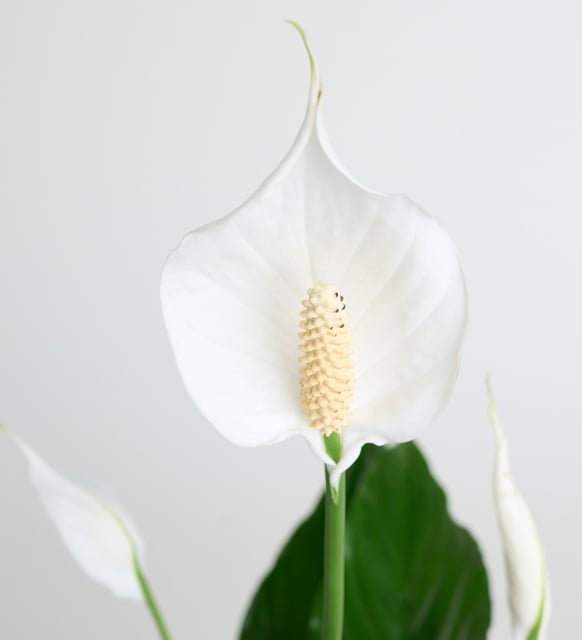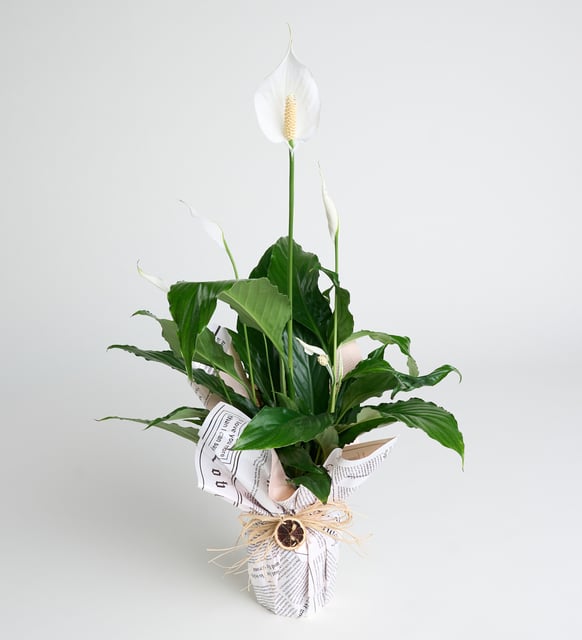 Yumuşak beyaz çiçekleriyle sessiz bir dinginlik… Spatifilyum, odanın ritmini yavaşlatır; sabah ışığıyla birlikte derin bir nefes gibi açılır. Gazete desenli saksının şehirli dokusu, zarif buket süslemesiyle birleşerek sade bir şiir yaratır. Doğal arındırıcı etkisiyle hava hafifler, mekan ferahlar; varlığı, telaşın kenarına narin bir huzur bırakır.