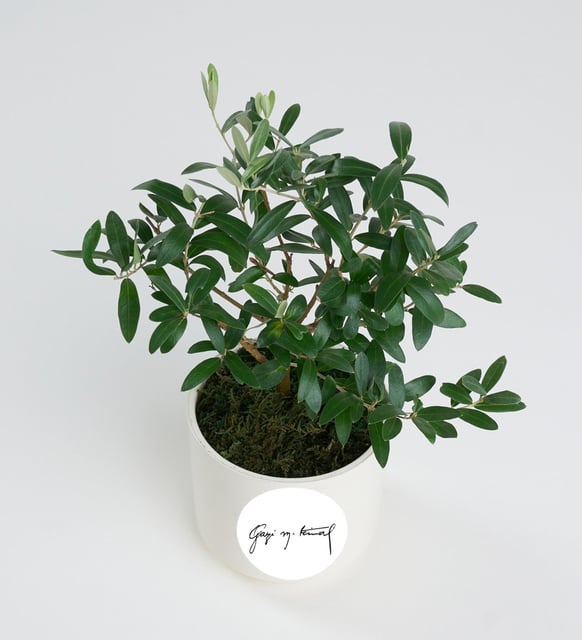 Yumuşak bir ışığın altında, zeytin yapraklarının gümüşe çalan titreyişi. Küçük bir Akdeniz peyzajı gibi; barışı, bilgeliği ve içten bir saygıyı odada usulca dolaştırır. Gazi M. Kemal baskılı vazonun zarif çizgileri, bu dinginliğe sessiz bir ağırlık, sade bir hatıra duygusu ekler.